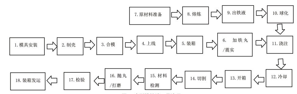 壳型线铸造工艺从模具安装和原材料准备开始,到装箱发运为止,具体流程如图1所示。