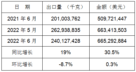 1-6月铝合金制车轮共计出口44万吨,同比增长-12.8%。其中:6月份出口7.1万吨,同比增长-10%,环比增长-5.7%,见表7和表8。