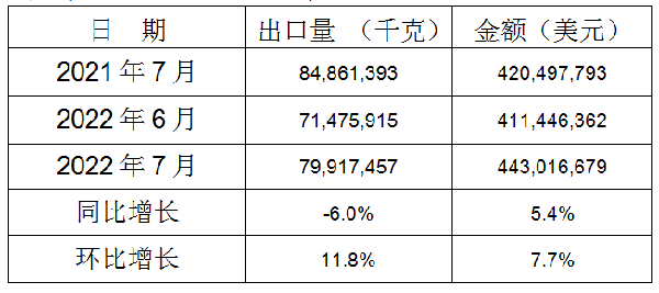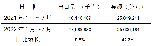 1-7月铸模及铸芯用粘合剂共计出口1.7万吨,同比增长9.8%。其中:7月份出口0.3万吨,同比增长36.0%,环比增长11.1%,见表11和表12。