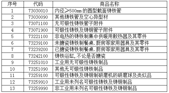 表 1:13个税则号黑色铸件