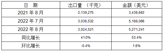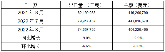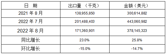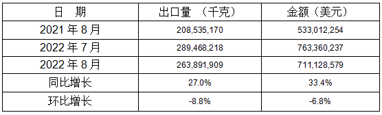 表 8:2022年8月同比、环比出口情况