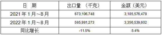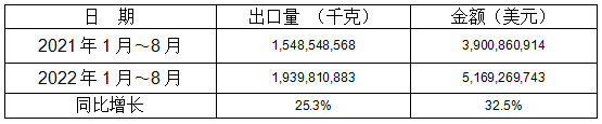 表 2:2022年1-8月同比出口情况