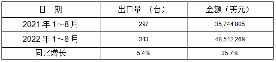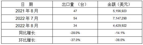 1-8月冷室压铸机共计出口313台,同比增长5.4%。其中:8月份出口34台,同比增长-28.0%,环比增长-37.0%,见表9和表10;