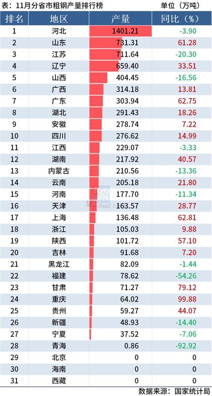 国家统计局数据显示,2022年11月全国粗钢产量7454.4万吨,同比增长7.3%;1-11月全国粗钢产量93511.3万吨,同比下降1.4%。